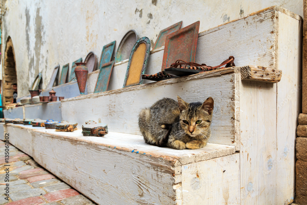 Cat sleeping between souvenirs in Essaouira Morocco