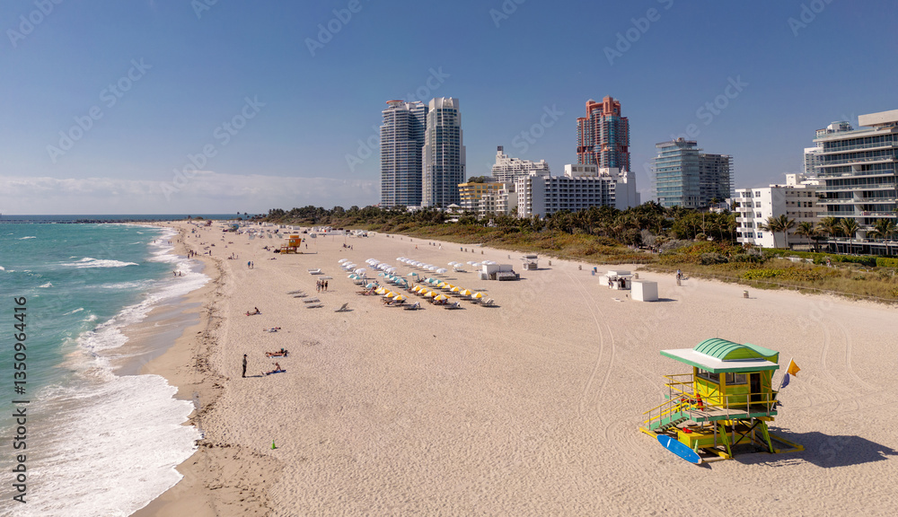 Miami Beach skyline. Miami from above. Miamis famous landmarks. South Pointe beach with skyscrapers. Miami city panorama. Miami skyline and ocean. South Florida. Vibrant South Beach.