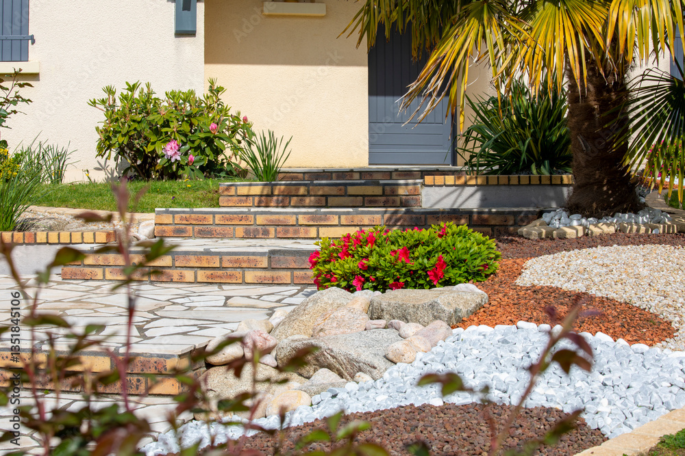 Charmant petit jardin naturel aménagé par un paysagiste au printemps.