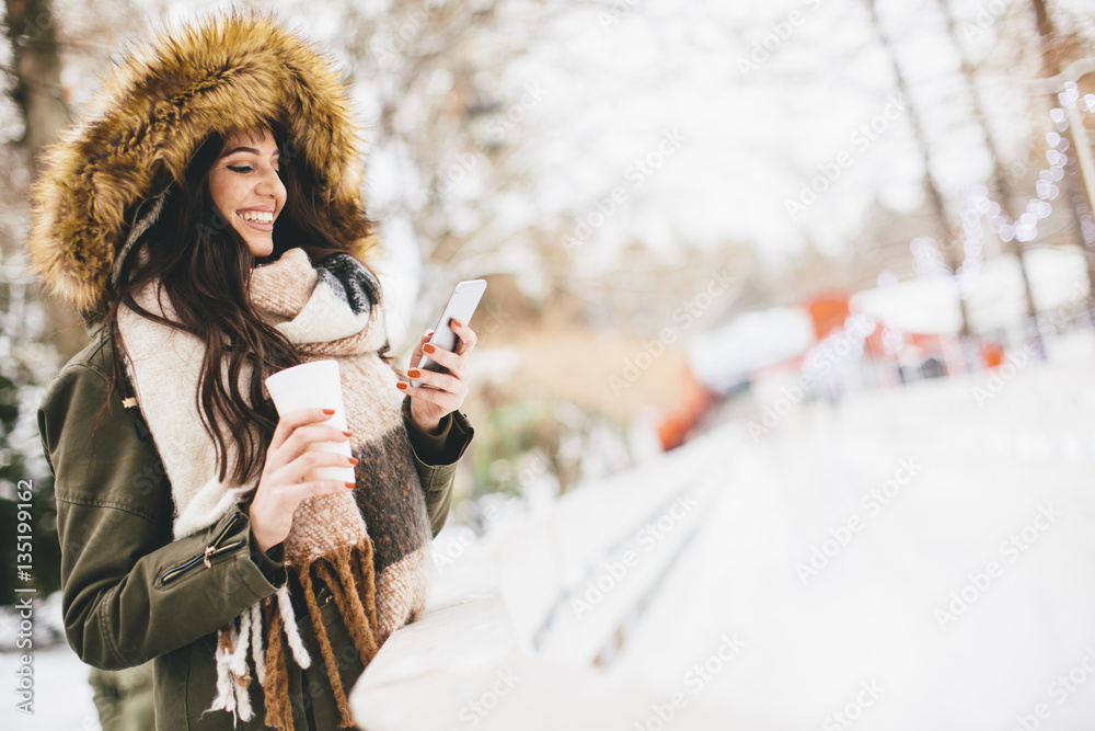 Young woman using a phone and drinking hot tea in the winter par