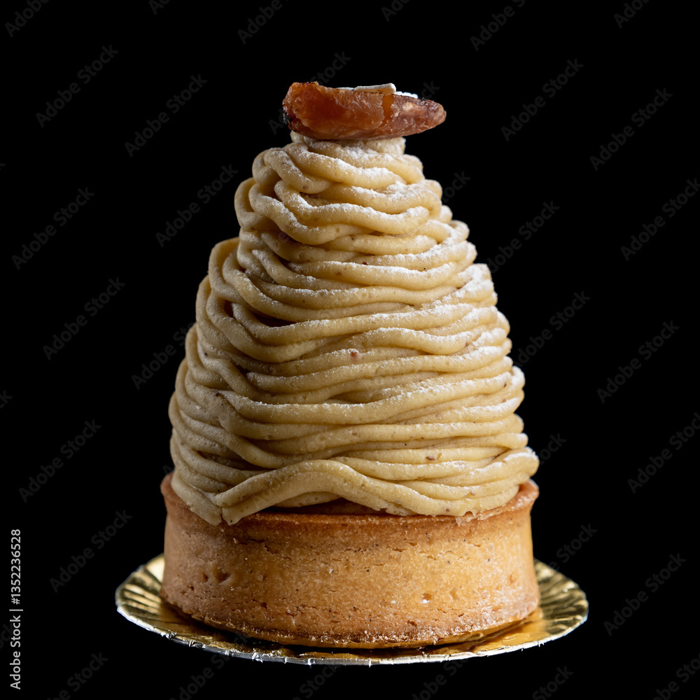 濃厚な栗のペーストを絞ったモンブランタルトケーキ 黒背景の切り抜き