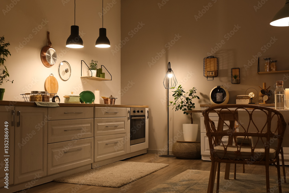 Interior of modern kitchen with glowing lamps, white counters, dishware and chair at evening