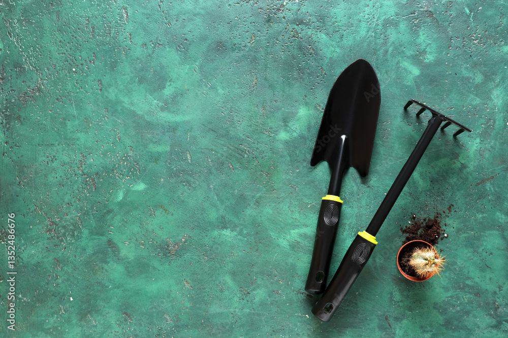 Gardening supplies with shovel, rake and mini cactus on green grunge background. Top view
