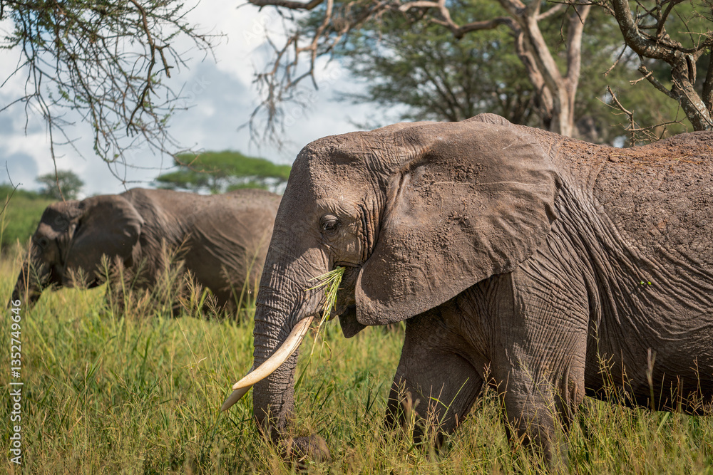 Zwei Elefanten grasen im hohen Gras in der Savanne des Tarangire Nationalpark in Tansania Afrika