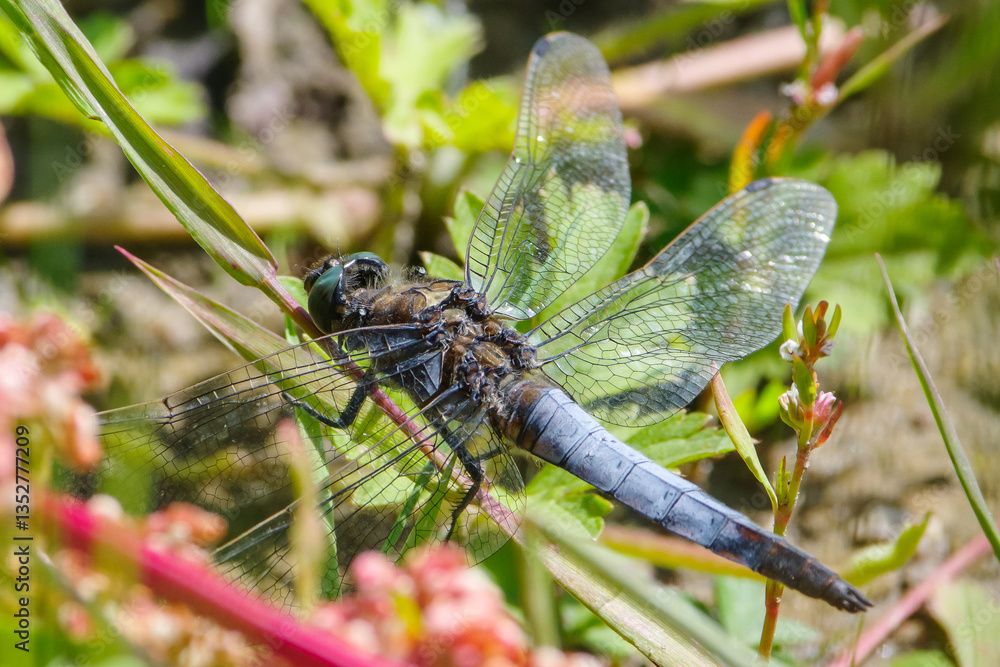 Dragonfly on Plant with Transparent Wings: Macro Photo with Blurry Background