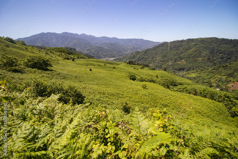 Mountain landscape with green grass and blue sky in the background. Adjara, Georgia