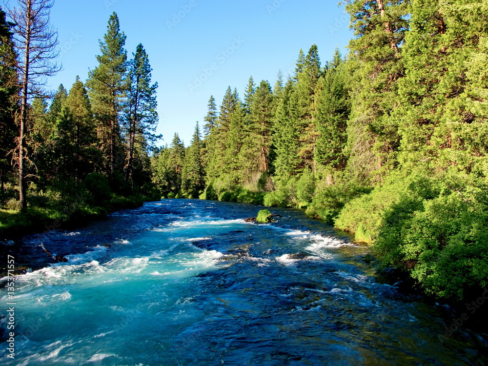 The amazing turquoise waters at Wizard Falls on the Metolius River in Central Oregon glowing with the morning sun.