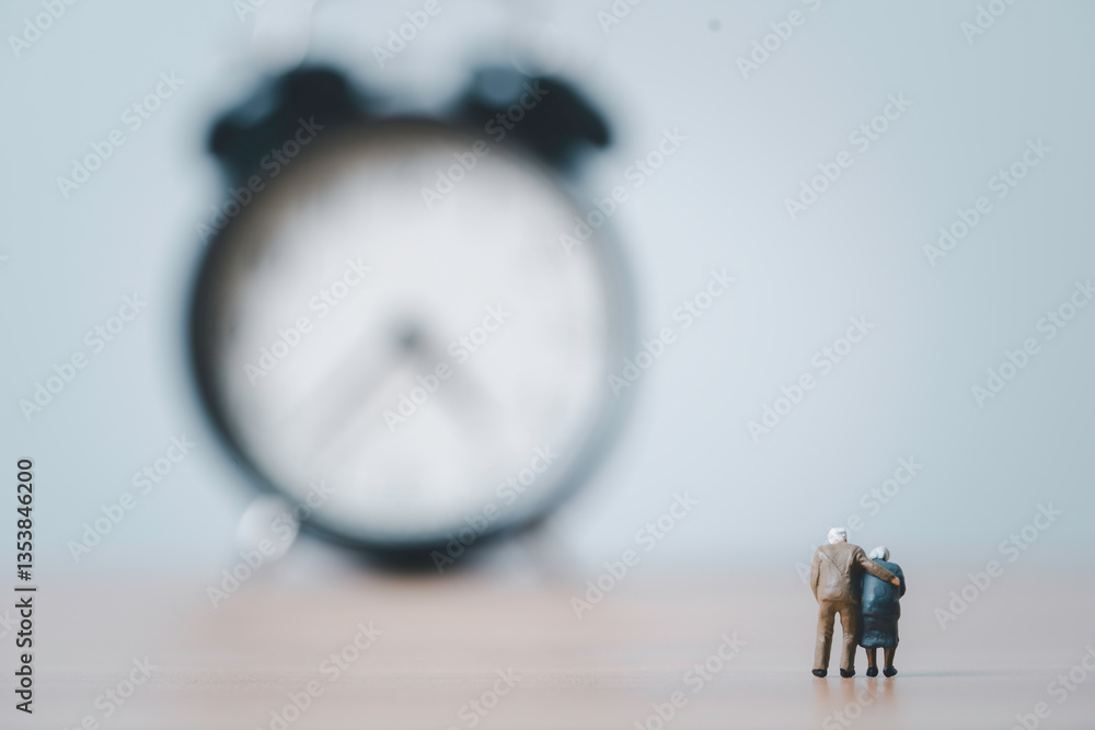 Old man and woman standing with blurred clock for countdown time to retirement concept.