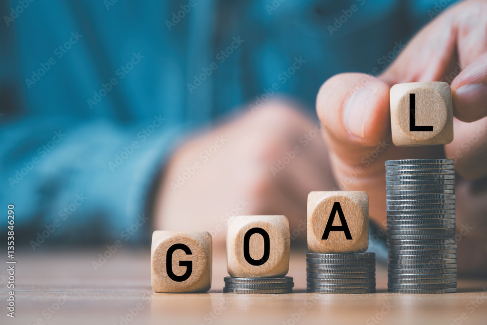 Businessman putting goal wording on the top of increasing coins stacking for financial objective target concept.
