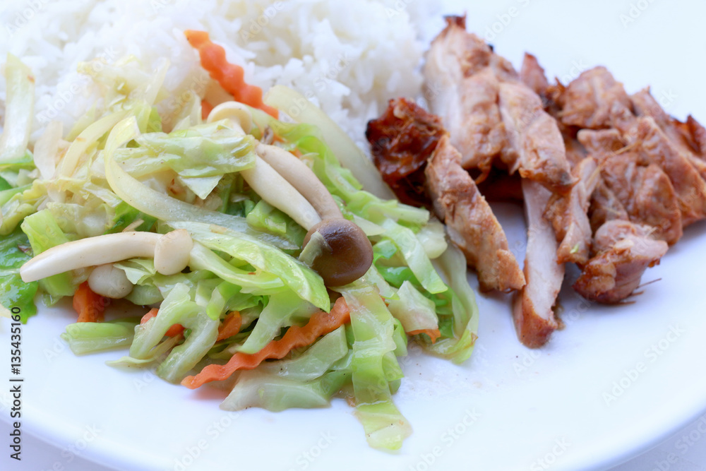 stir fried vegetables and Grilled chicken breasts with thai jasmine rice in white dish isolated on white background. Thai style Food.