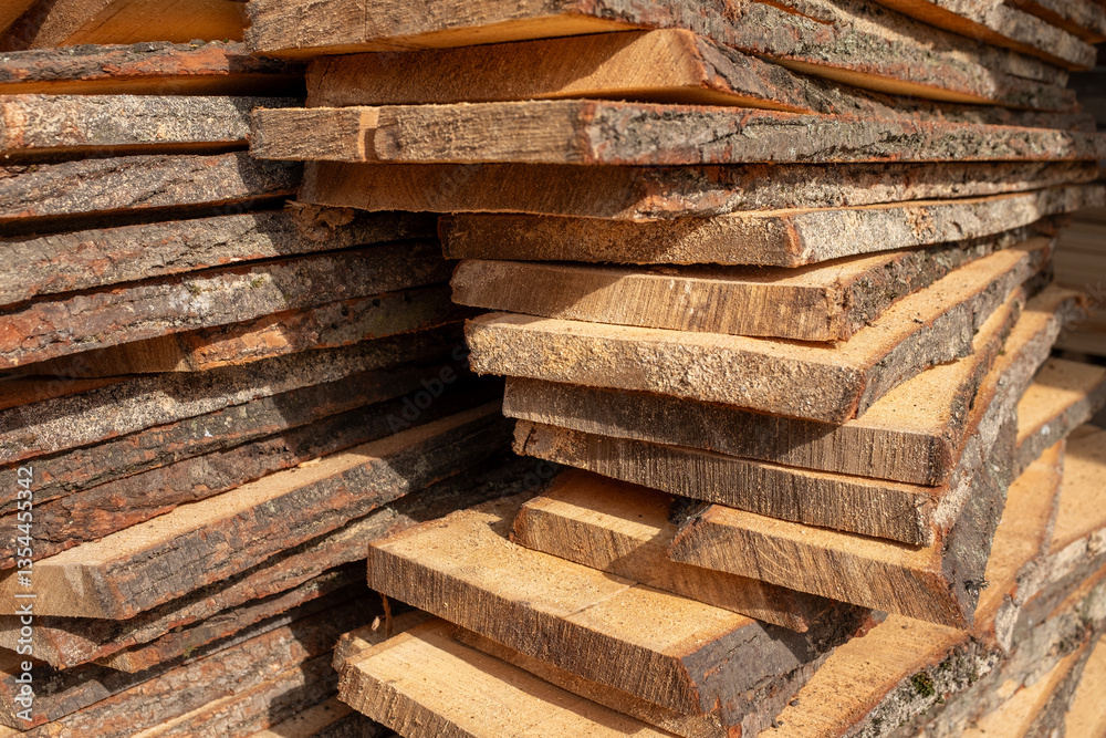 Wooden planks. Air-drying timber stack. Texture of folded wooden planks in a warehouse with a forest. View from the end Wood air drying (seasoning lumber or wood seasoning). Timber. Lumber. Close-up.