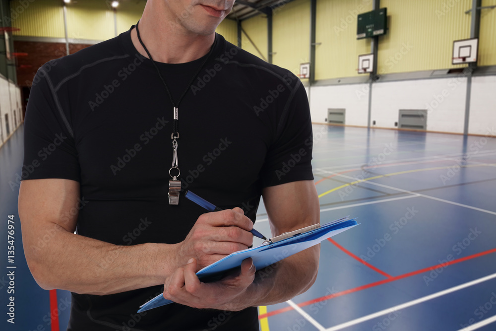 Basketball, handball trainer with workout plan close up on basketball field. Team sport, fitness and healthy life style concept.