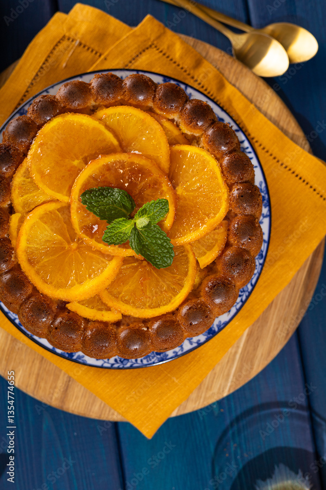 Loaf of orange bread covered with a confectionery glaze with juice and decorated with orange slices. Chiffon cake on a pastry grill next to cup of tea. Navy blue background