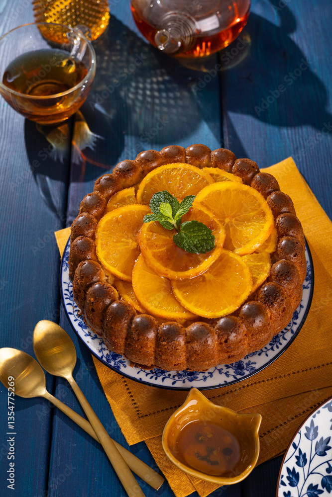 Fluffy aromatic orange cake decorated with fresh orange slices and mint on wooden navy blue background, top view, flat lay with text space. Horizontal orientation