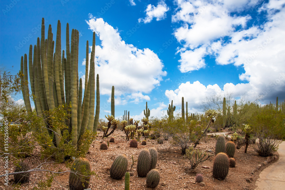 A gorgeous landscape at Desert Botanical Garden with cactus, trees, plants and grass in Phoenix Arizona USA