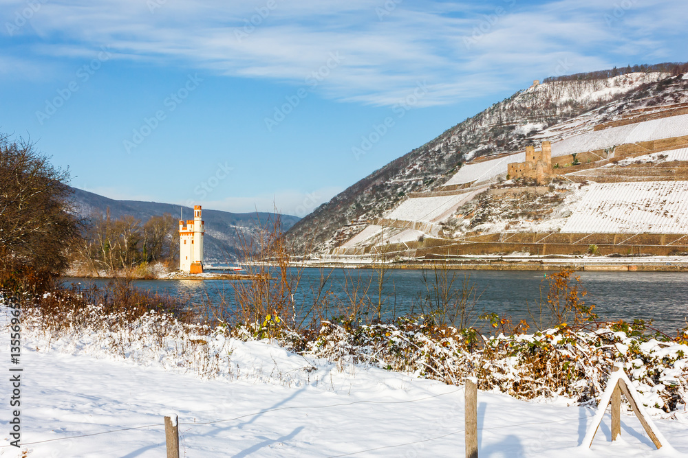 Rhein bei Bingen. Links Mäuseturm, rechts Burg Ehrenfels. Dezember 2012.