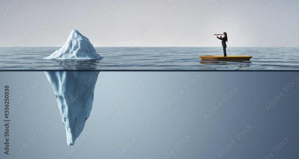 Businesswoman on a boat looking through a telescope at a floating iceberg, revealing a massive hidden part underwater. Concept of risk and strategy.