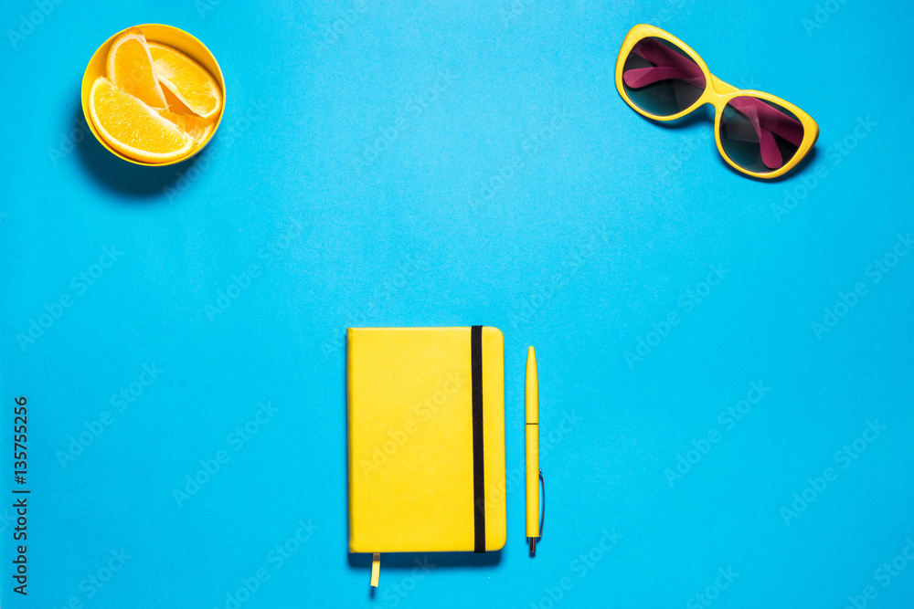 Stylish minimalistic feminine fashion workspace. Bright yellow glasses and diary with pen, pirces oranges against deep blue copy space. Top view.