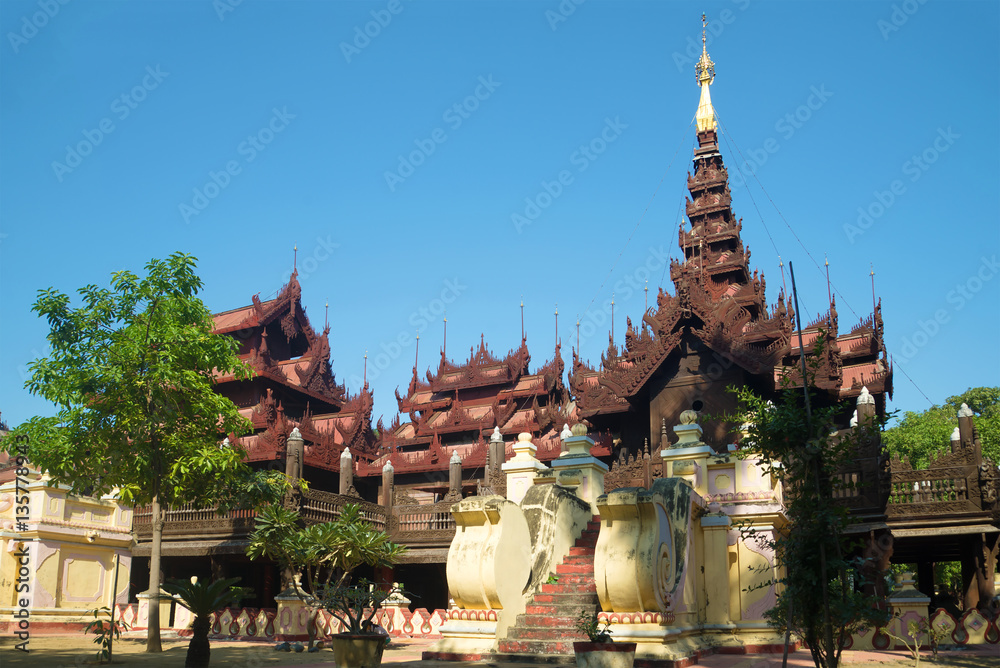 Old pagoda teak wood of Shwe In Bin Kyaung monastery a sunny day. Mandalay, Myanmar