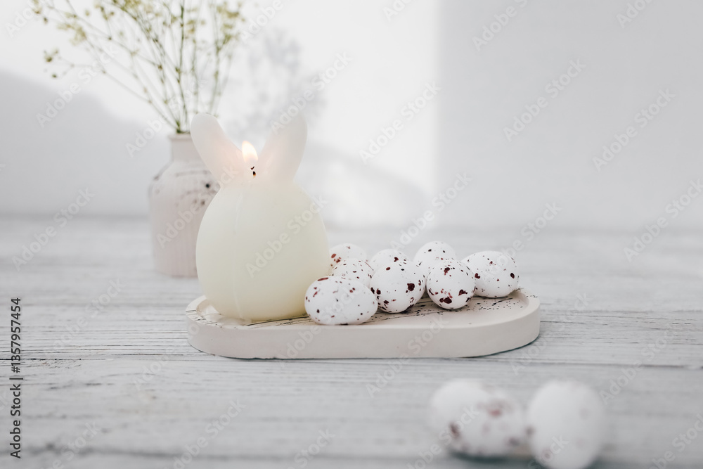Easter spring-inspired display with a vase of flowers and decorative eggs on a neutral table.
