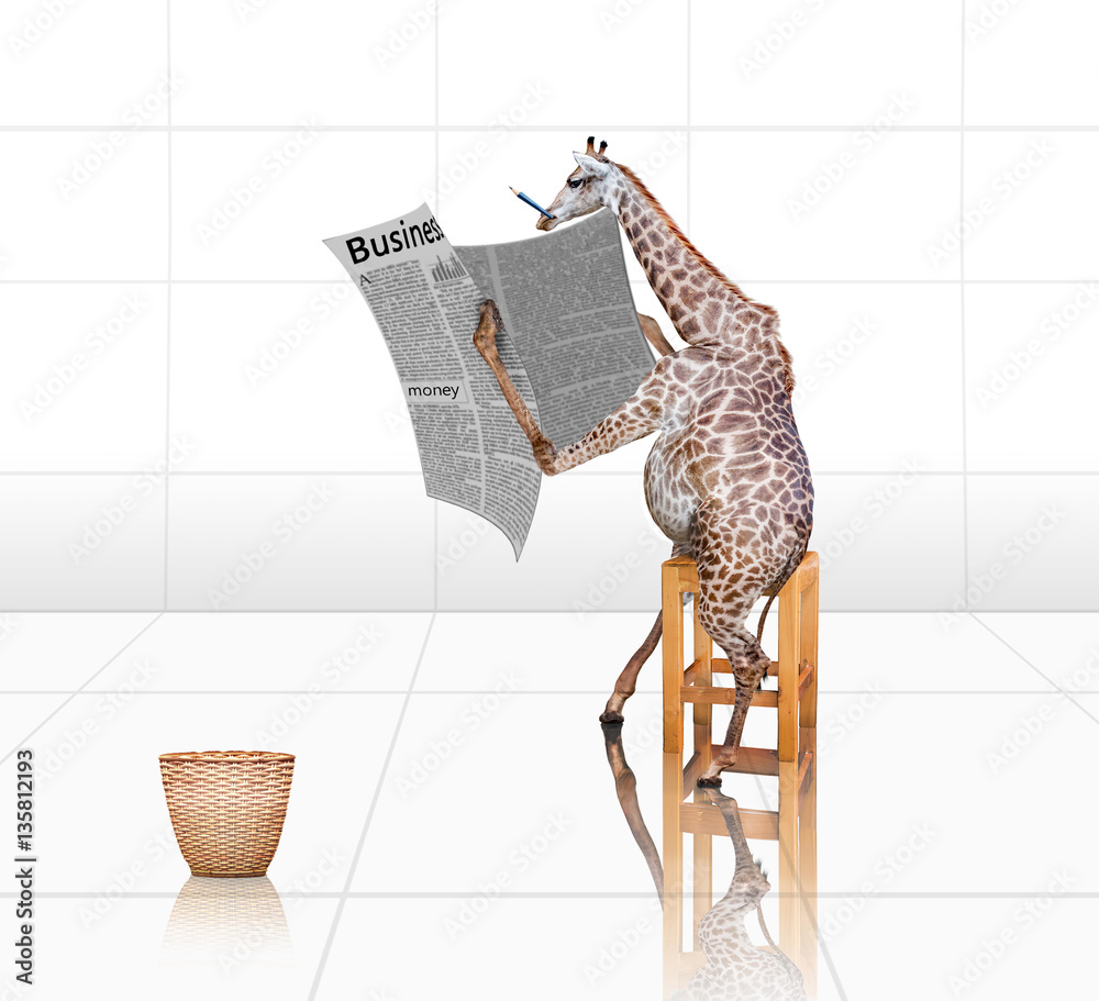 Giraffe are reading financial newspapers.Photo combination conce