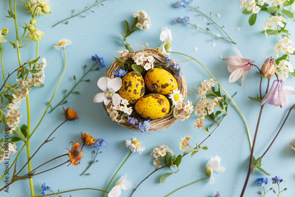 Easter flat lay. Stylish easter eggs in nest and spring flowers on blue background. Easter modern floral banner. Season greetings