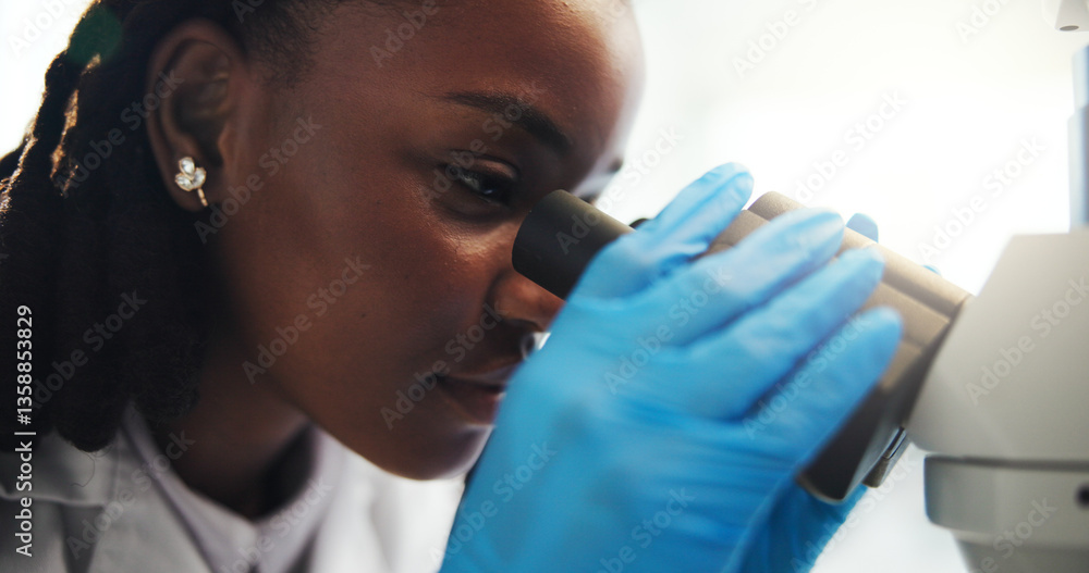 Microscope, scientist and black woman with research, healthcare innovation or chemistry experiment. Science, laboratory and microbiology for medical development, pharma study or test for dna analysis