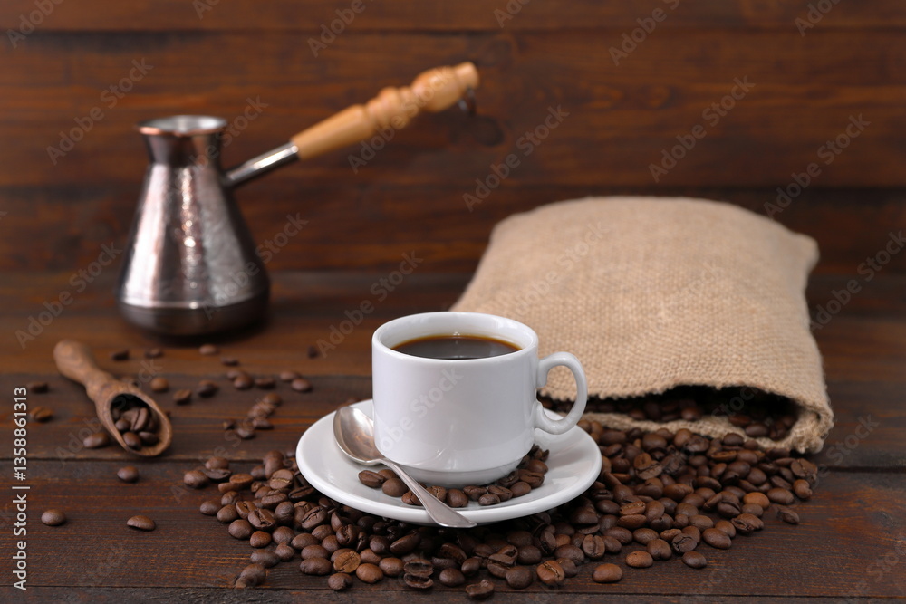 On a brown wooden background there is a white cup of coffee, next to a copper turk, a scattering of coffee beans from a burlap sack and a wooden scoop with coffee beans.