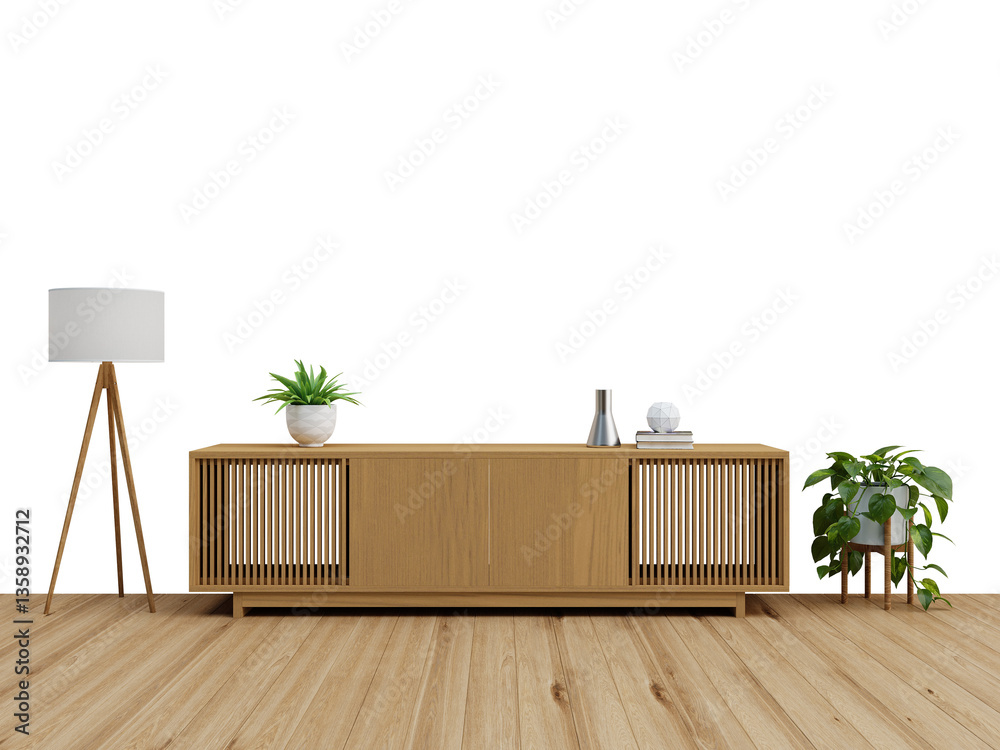 Free PNG wallpaper mockup Stylish living room interior with wooden furniture, plants, and a lamp in Interior Living Room, 3D rendering