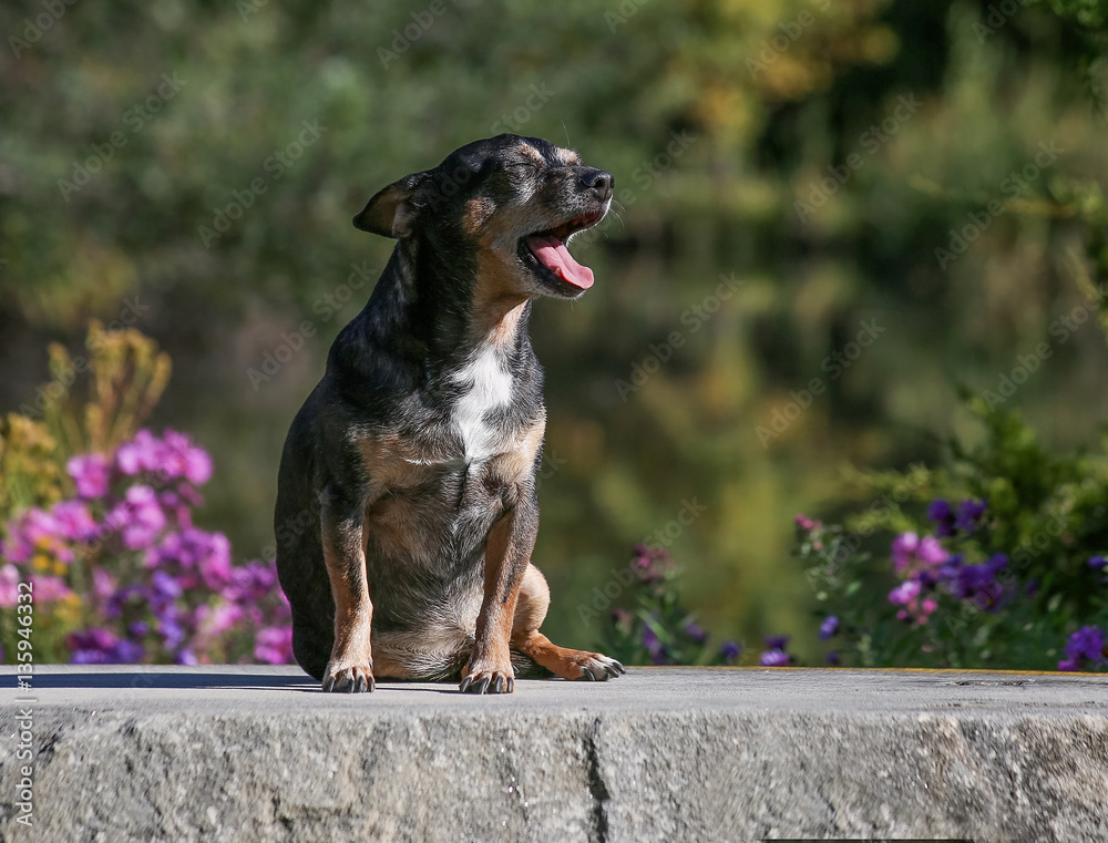 a cute chihuahua mix yawning on a hot summer day on a bench