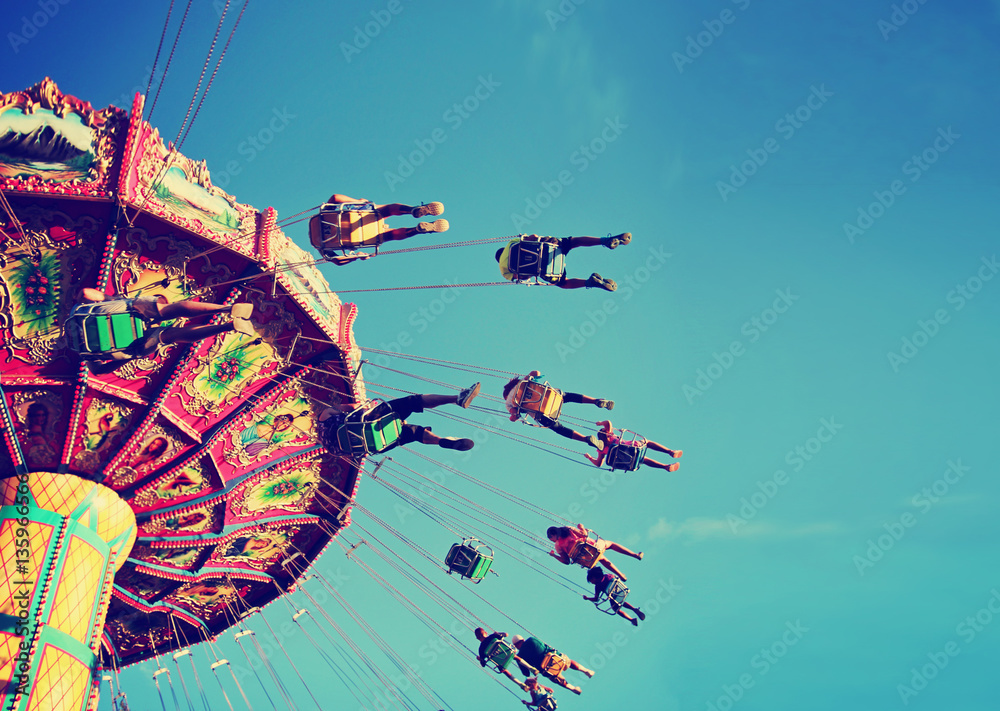 a swinging fair ride at dusk toned with a retro vintage instagram filter