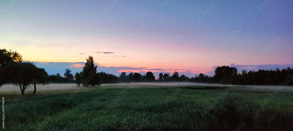 Panorama of the countryside at dawn. Fog in the distant valley against the background of trees.Bright colorful sky with clouds. Endless grassy fields in the morning light. Incredible rebirth of nature