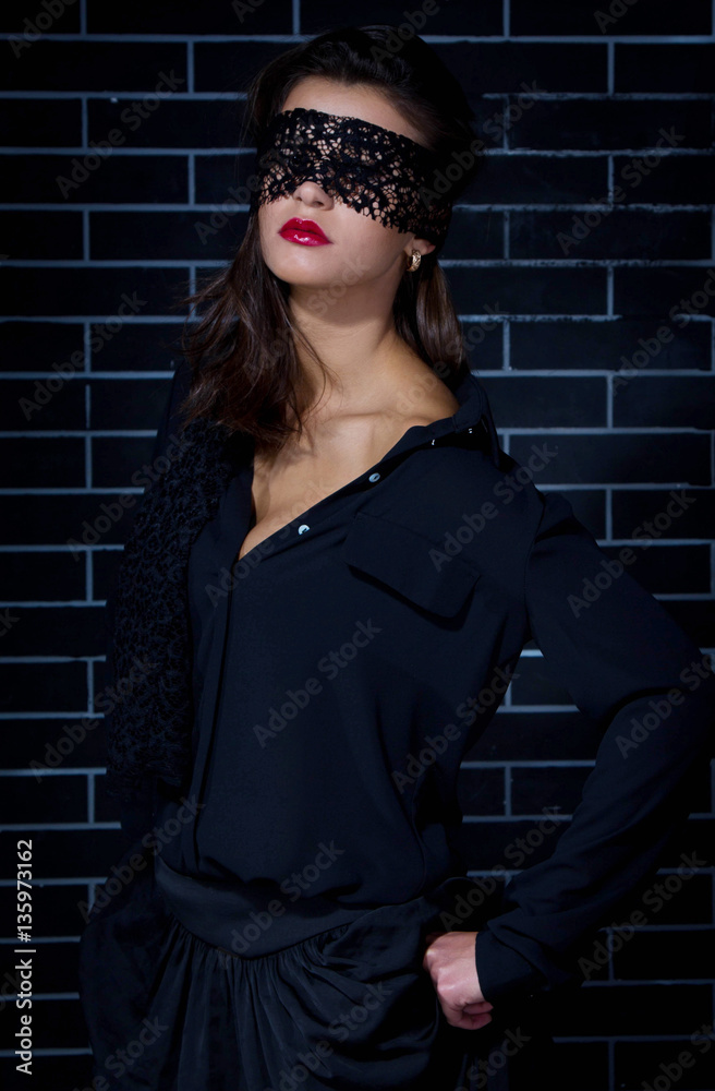 Woman with lace ribbon on eyes