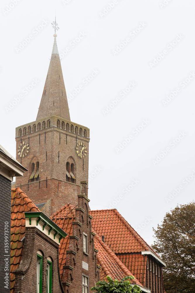 Church tower of the De Burght church in the centre of the rural village of Den Burg on Texel in the Netherlands.