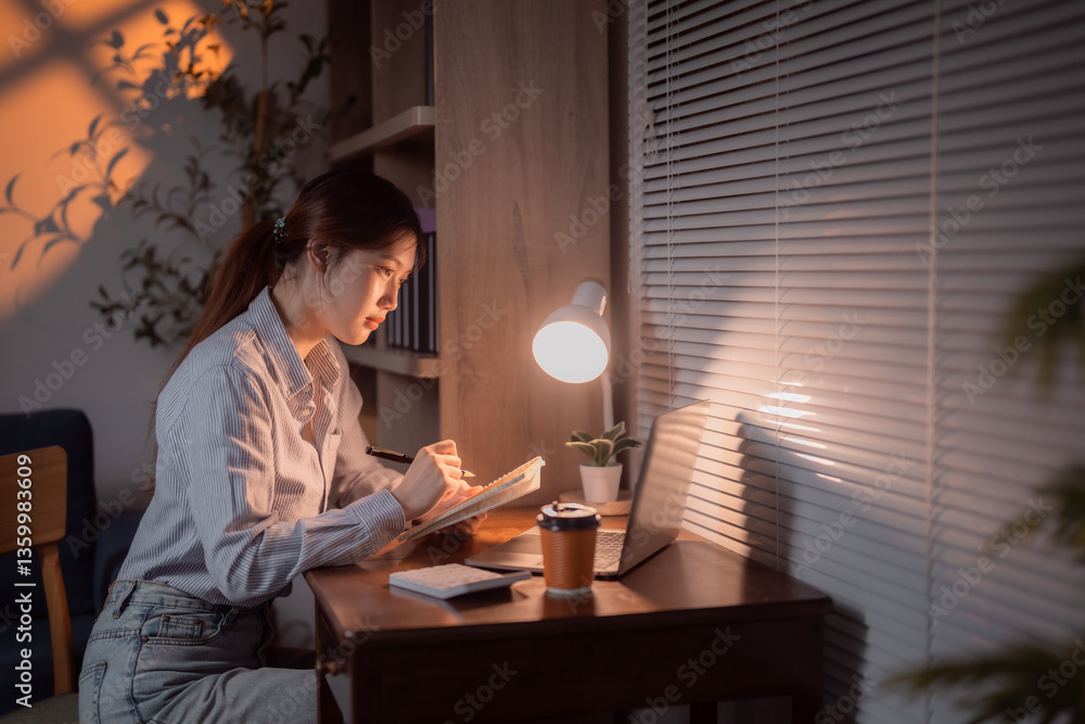 Asian businesswoman writing on notebook while using laptop computer working from home at night, desk lamp illuminating workspace and window blinds casting shadows