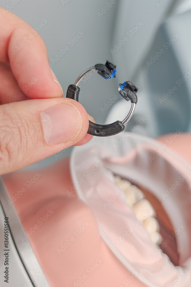 Dentist holding a matrix clamp for dental restoration precision tool for tooth filling treatment oral care professional orthodontic procedure medical equipment hygiene sterile modern technology