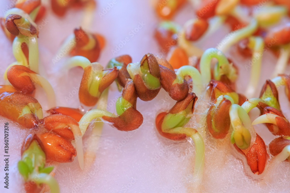 Cress seeds germinating on a cotton wool substrate two days after sowing; cress, rich in microelements, grown at home.
