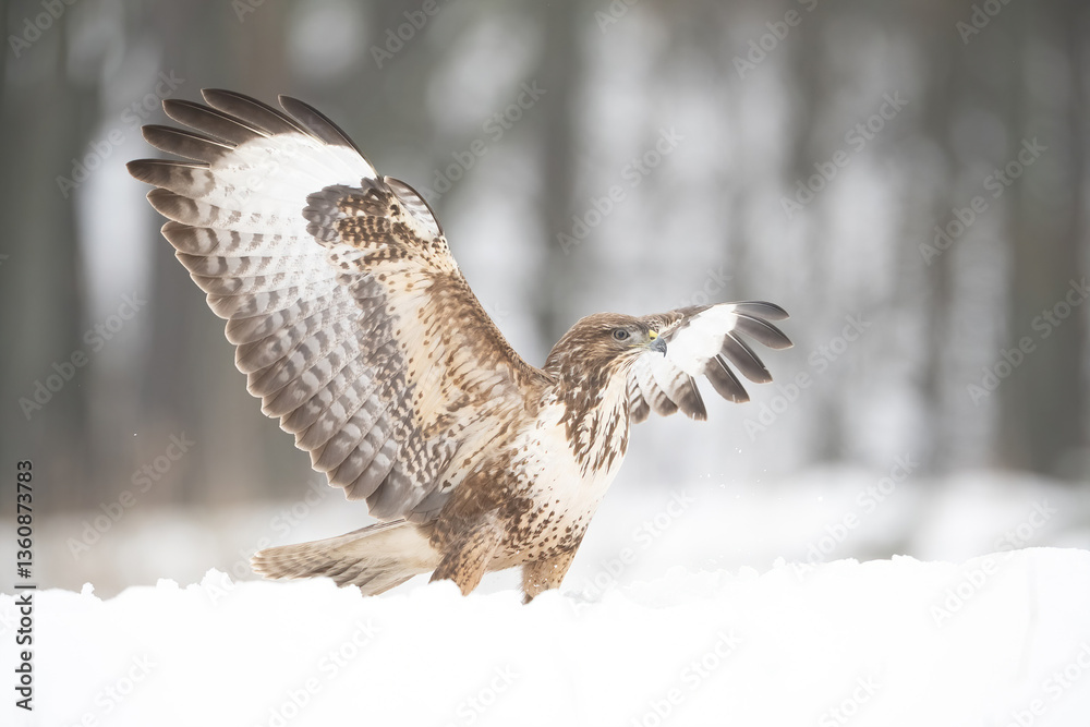 Common Buzzard (Buteo buteo). Bird Landing in Deep Snow. Snow-covered forest floor in winter light. Striking wing spread reveals detailed plumage against a bright white background.