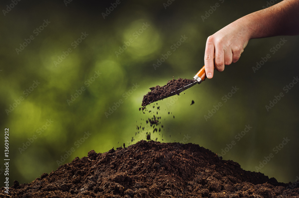 Hand pouring black soil with shovel on green bokeh background. Planting a small plant on a pile of soil or pouring soil during funeral. Gardening backdrop for advertising.