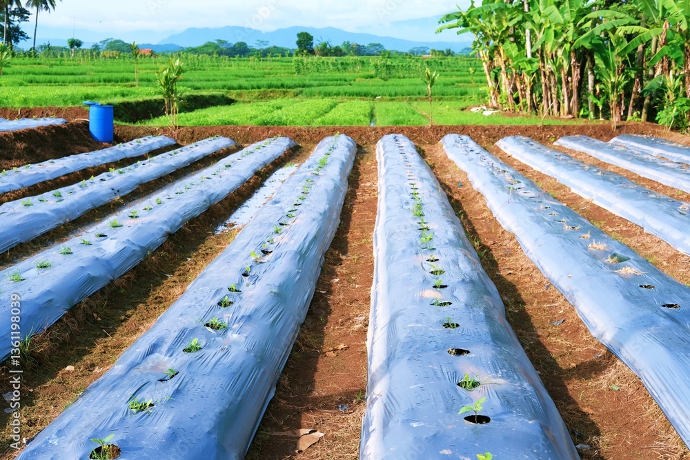 A modern vegetable farm with plastic mulch covering raised beds. Young plants sprout from evenly spaced holes, optimizing growth and moisture retention. Lush green fields and mountains