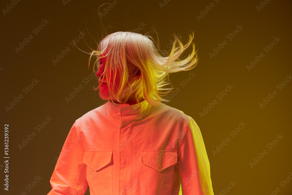 stylish portrait, contemporary fashion, dynamic movement, colored lighting, modern aesthetics, energetic expression, high contrast background, artist in action, vibrant colors, creative photography