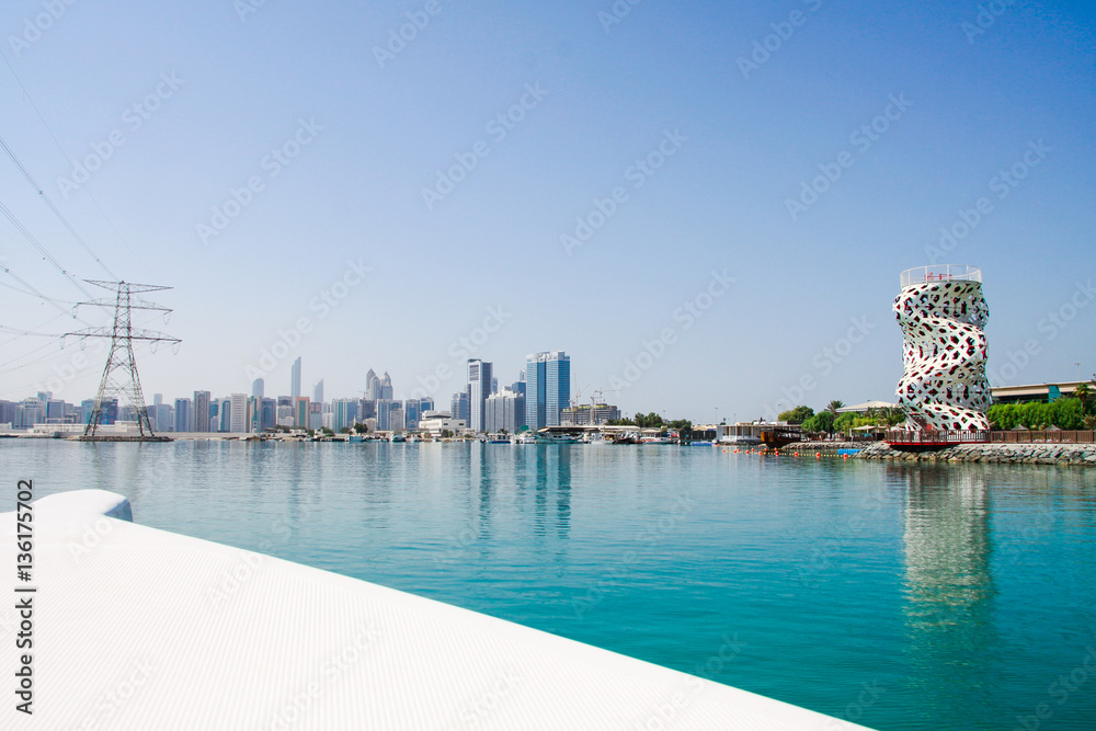 Quay in front of skyscrapers in Abu Dhabi, United Arabian Emirates (UAE)