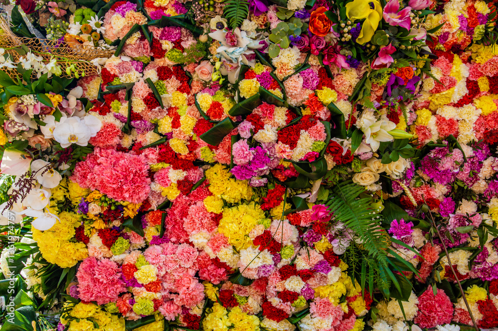 "Vibrant Natural Flower Wall Background – Colorful Floral Backdrop with Fresh Blooming Roses, Peonies, Lilies, Daisies, Orchids, and Wildflowers for Wedding, Event. Backdrop flowers Decorative Design"
