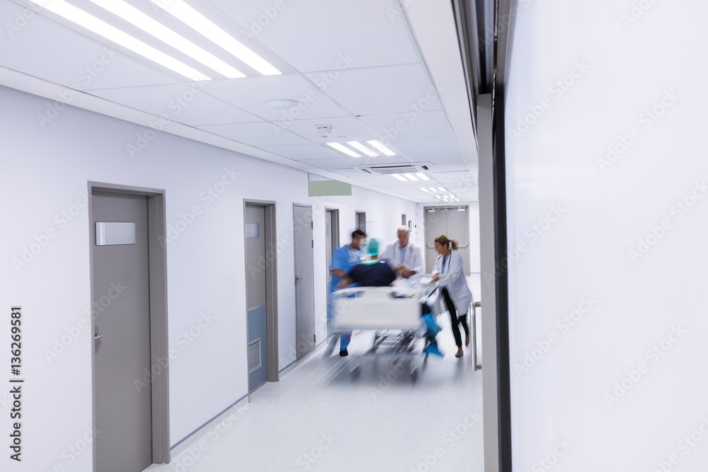 Doctors and nurse pushing emergency stretcher bed in corridor