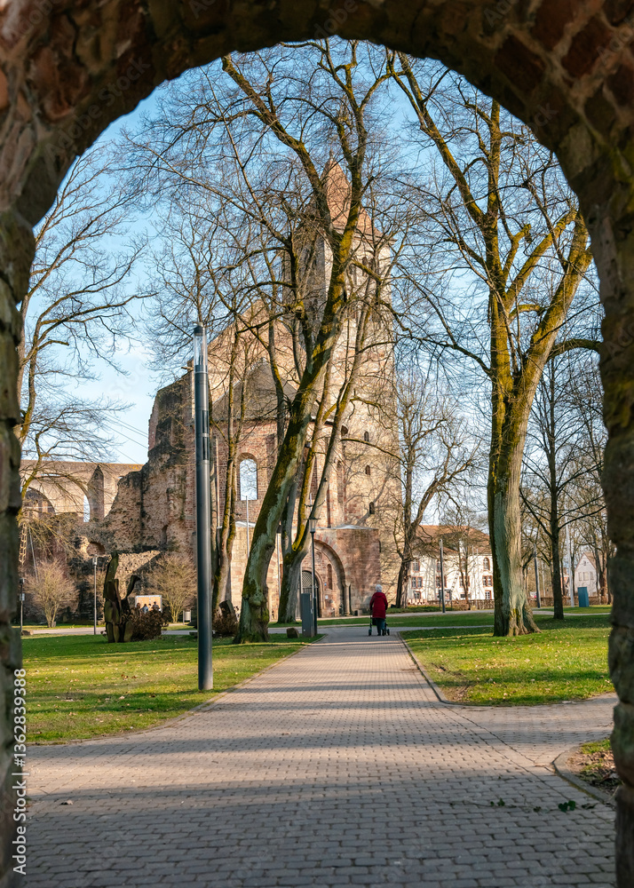 Ancient ruins rise majestically under a clear blue sky, framed by a stone arch with a single person walking towards the structure. Bare trees line the path enhancing the scene's historic charm