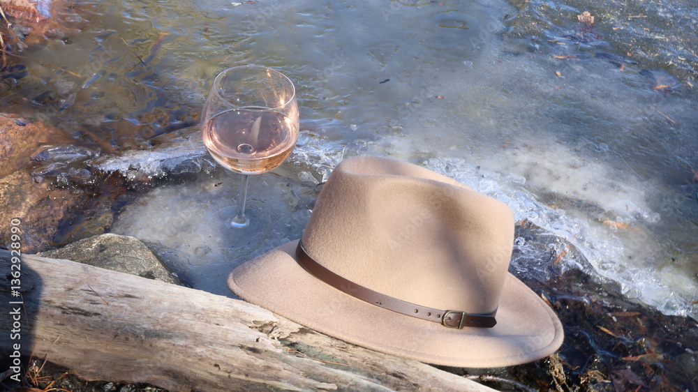 glass of rose and a stylish hat sitting on a frozen lake beside a piece of driftwood