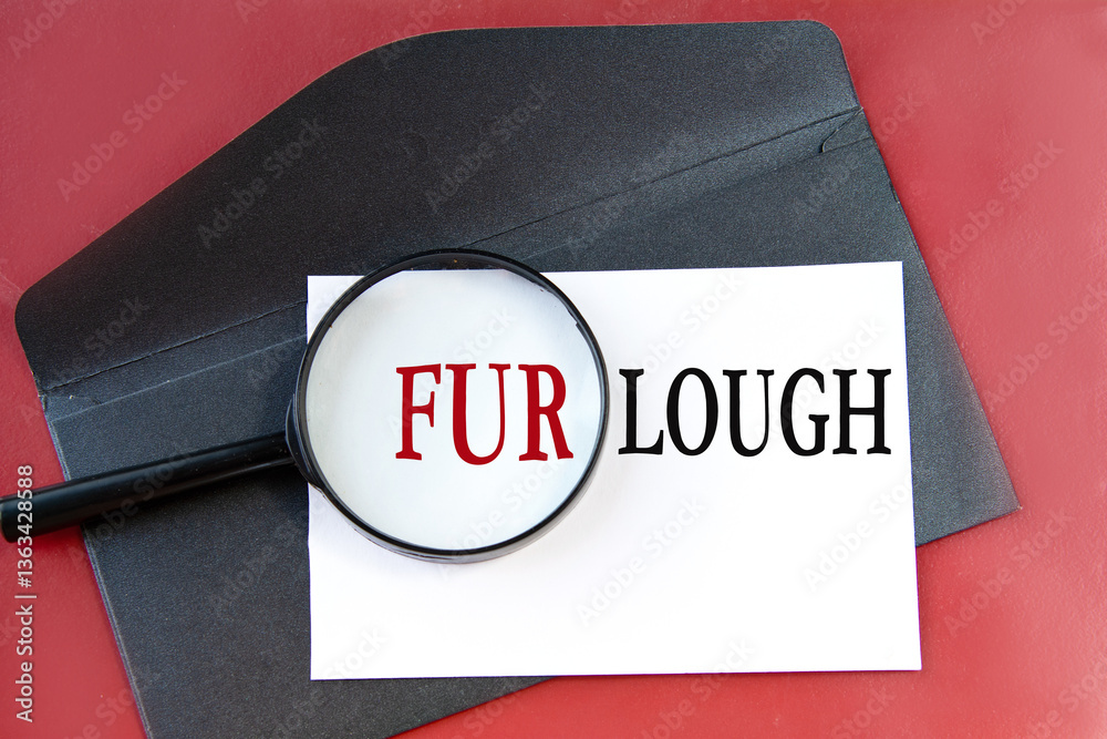 FURLOUGH - word on white paper lying on a black envelope on a red background