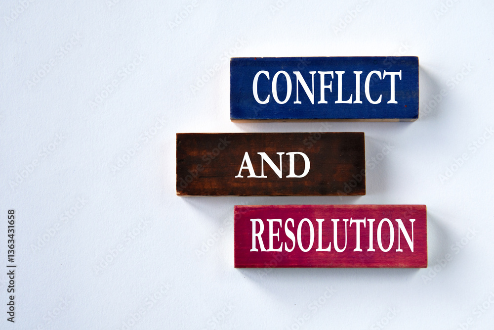 CONFLICT and RESOLUTION - words on colorful wooden blocks on a grey background