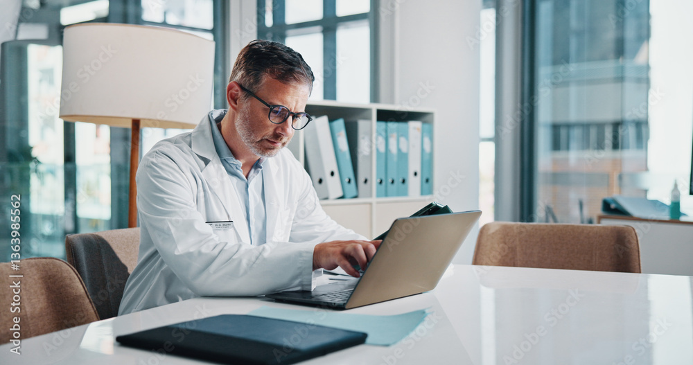 Healthcare, laptop and report with doctor man at desk in office of hospital for diagnosis, planning or research. Computer, medical and mature medicine professional with pointing or reading in clinic