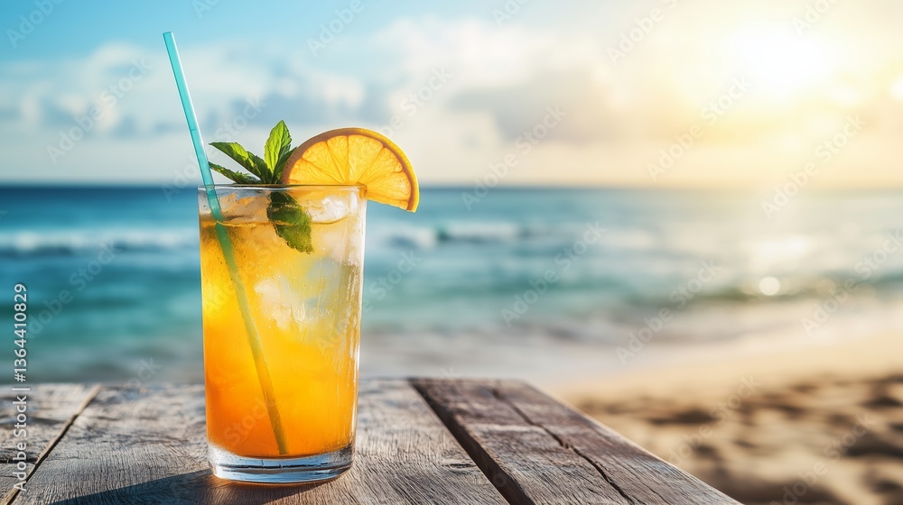 Refreshing tropical summer drinks with citrus fruits and mint leaves served in clear glasses on a wooden table by the beach with a bright ocean backdrop, perfect for holiday and vacation concepts.
